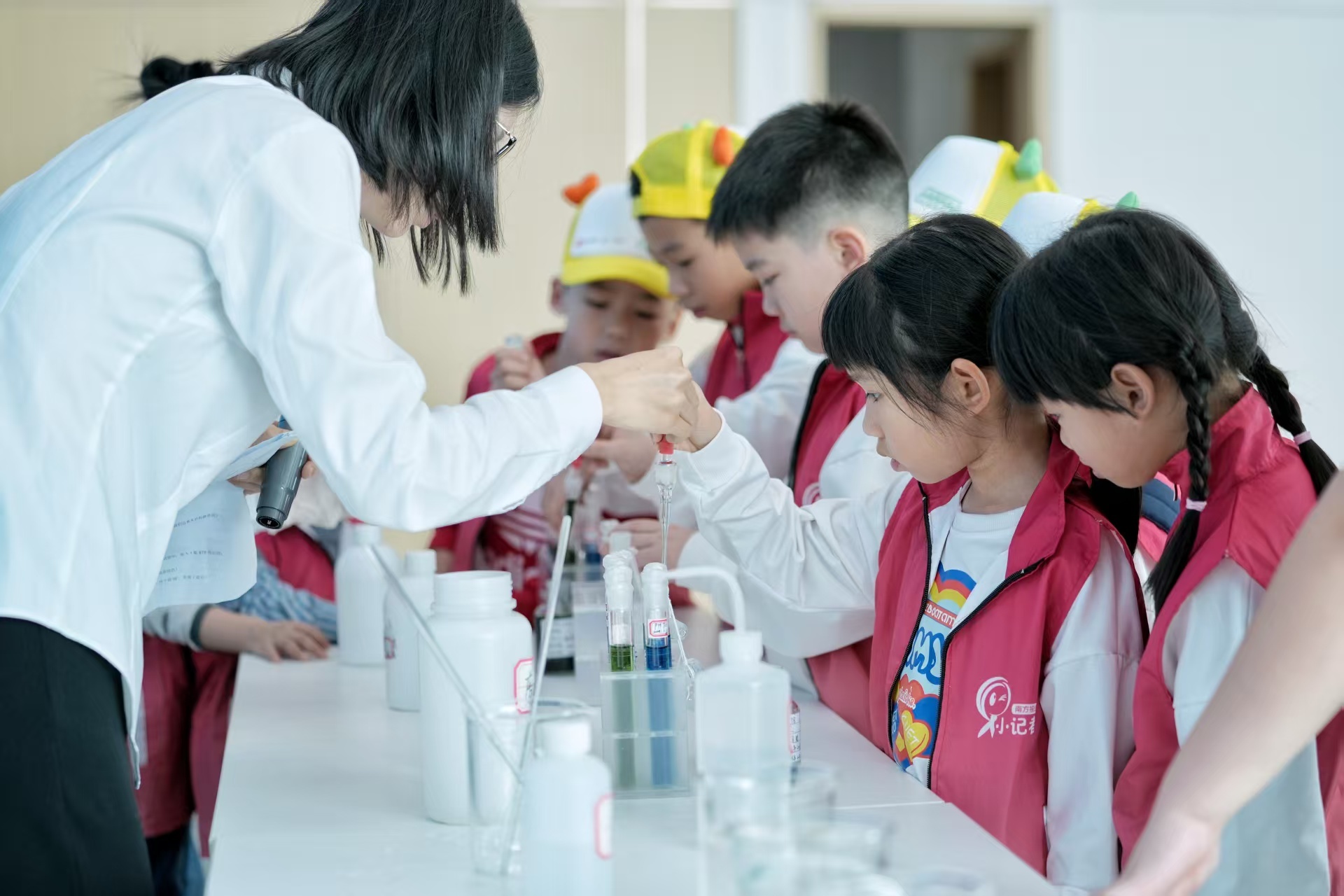 在“水质小课堂”,水质检测员用“警员捏坏东谈主”“血液体检”等灵活比方,串联起混凝千里淀、酸碱度(pH值)探秘等商量实验。孩子们听得饶有益思,奋勇上台化身“水质化验员”。他们注意翼翼地向水样中滴加絮凝剂,不雅察水样的小颗粒如安在絮凝反映下抱团、下千里,使水体变得澄澈透明,再进一步滴加pH试剂,不雅察其感情变化。